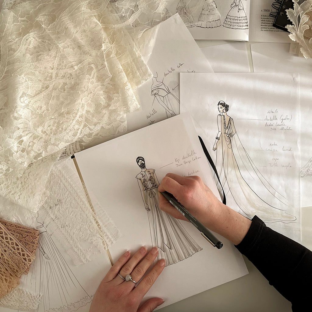 Chaque création est conçue dans le respect d'un savoir-faire traditionnel. Alexandra Fabbri privilégie et sélectionne pour vous des étoffes de qualité : dentelles de Calais, tulles brodés d’Espagne, soieries françaises ou européennes.