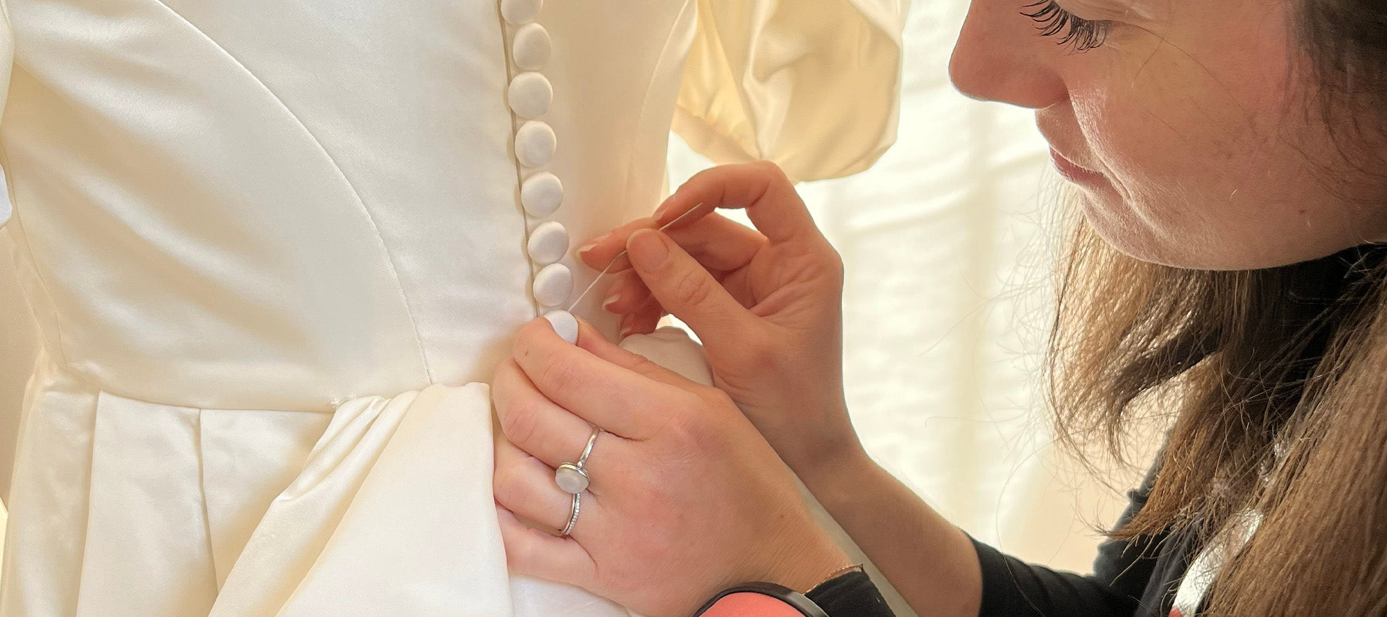 Vous découvrez votre robe dans son tissu définitif. Alexandra Fabbri ajuste les derniers détails : la longueur de la robe, celle des manches. Les retouches sont effectuées afin que votre robe soit parfaite.