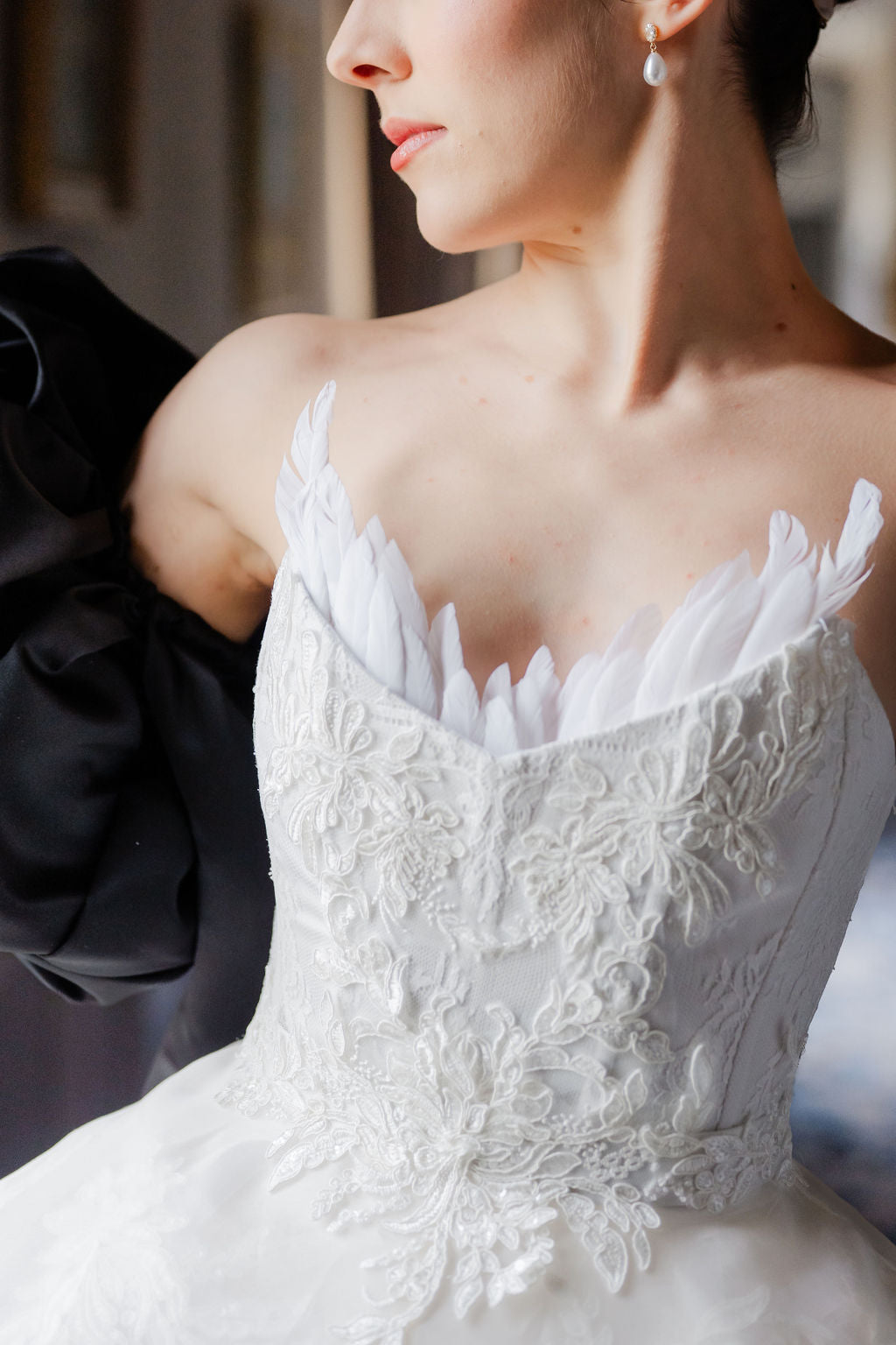 Savoir-faire d'exception : broderie perlée, fleurs en soie, plumasserie...