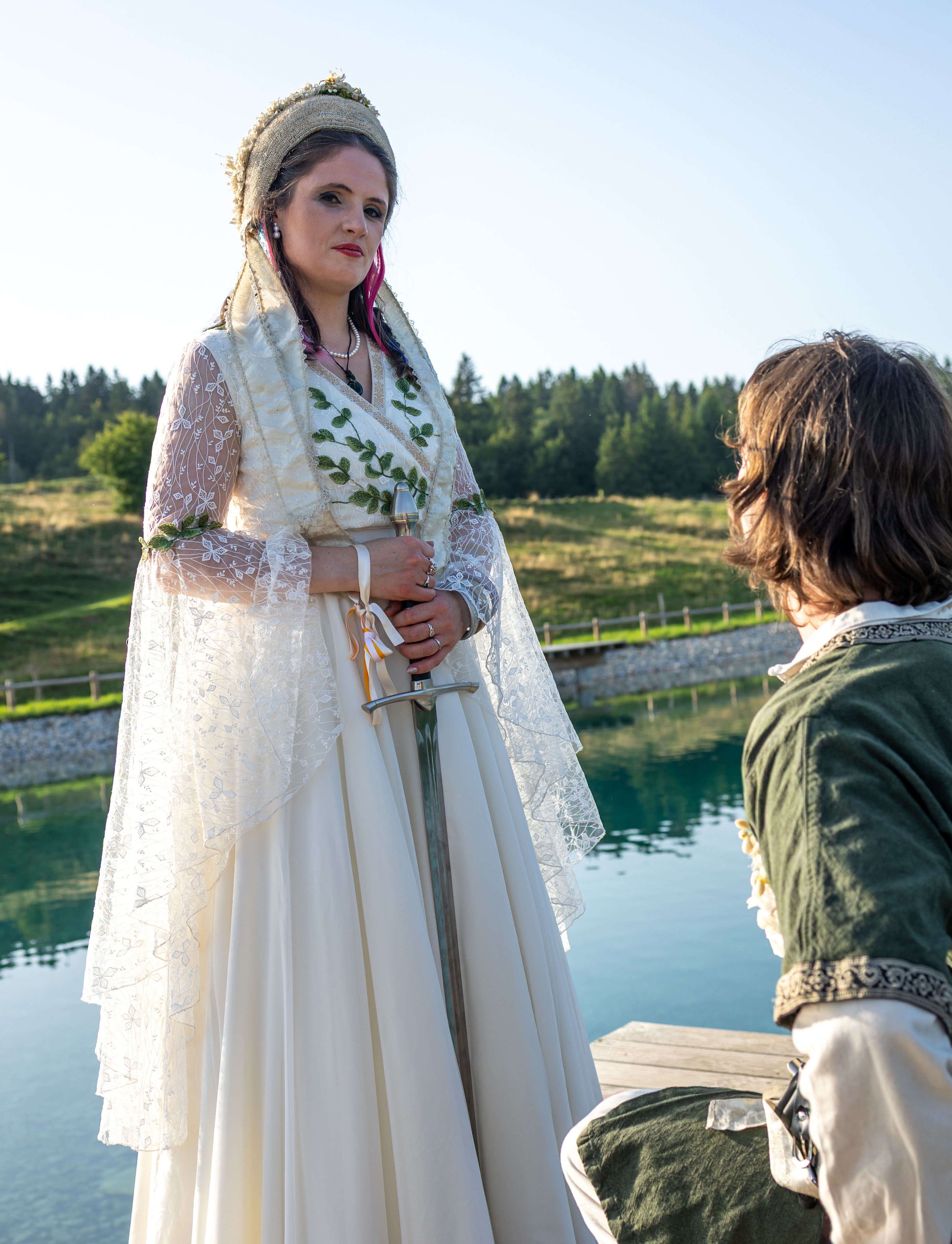 La robe se transforme au fil de la journée, comme un récit en deux actes. Pour la cérémonie, elle s’accompagne d’un boléro en dentelle, aux manches longues et évasées d’inspiration médiévale, brodées de motifs à feuillages, offrant une dimension presque liturgique.
