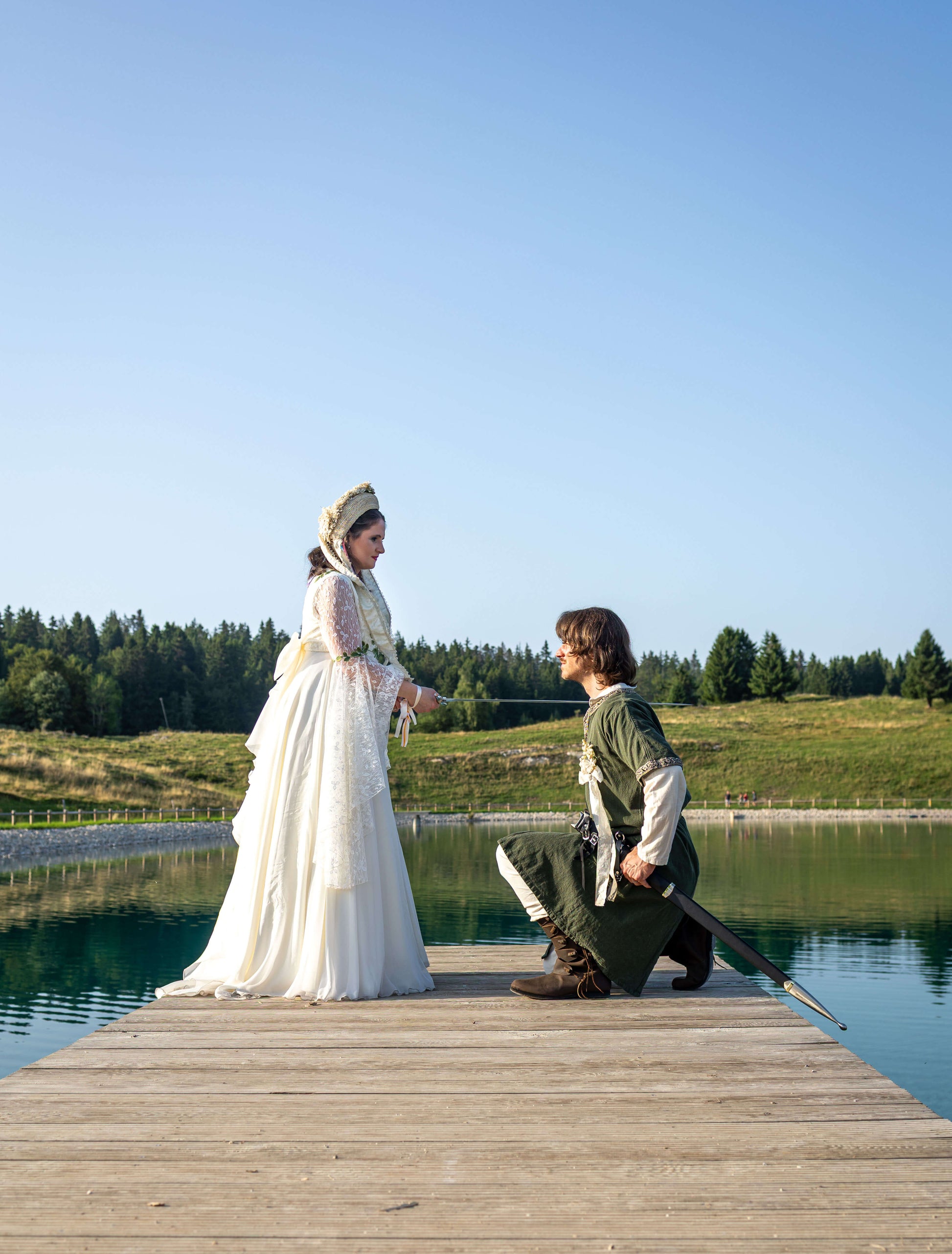 Le soir, la silhouette s’allège : la robe antique se révèle, ceinte d’un corset vert tendre, ton sur ton avec la tenue du marié – symbole d’union et d’équilibre.